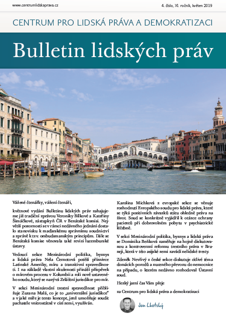 Květnové vydání Bulletinu lidských práv zahajujeme již tradiční zprávou Veroniky Bílkové a Kateřiny Šimáčkové, zástupkyň ČR v Benátské komisi. Největší pozornosti se v rámci nedávného jednání dostalo stanovisku k maďarskému správnímu soudnictví a zprávě k tzv. ombudsmanským principům. Dále se Benátská komise věnovala také revizi lucemburské ústavy.