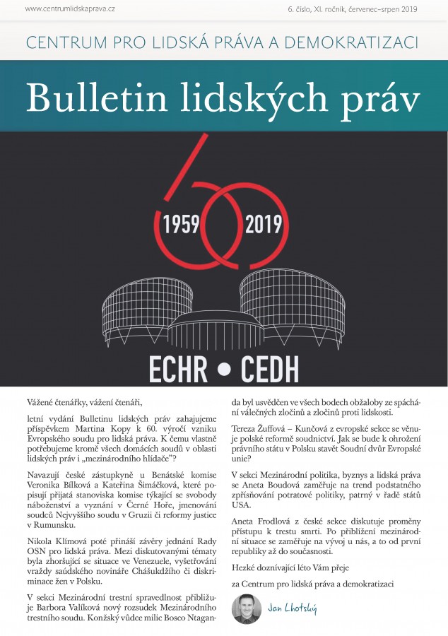 Letní vydání Bulletinu lidských práv zahajujeme příspěvkem Martina Kopy k 60. výročí vzniku Evropského soudu pro lidská práva. K čemu vlastně potřebujeme kromě všech domácích soudů v oblasti lidských práv i „mezinárodního hlídače”?
